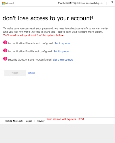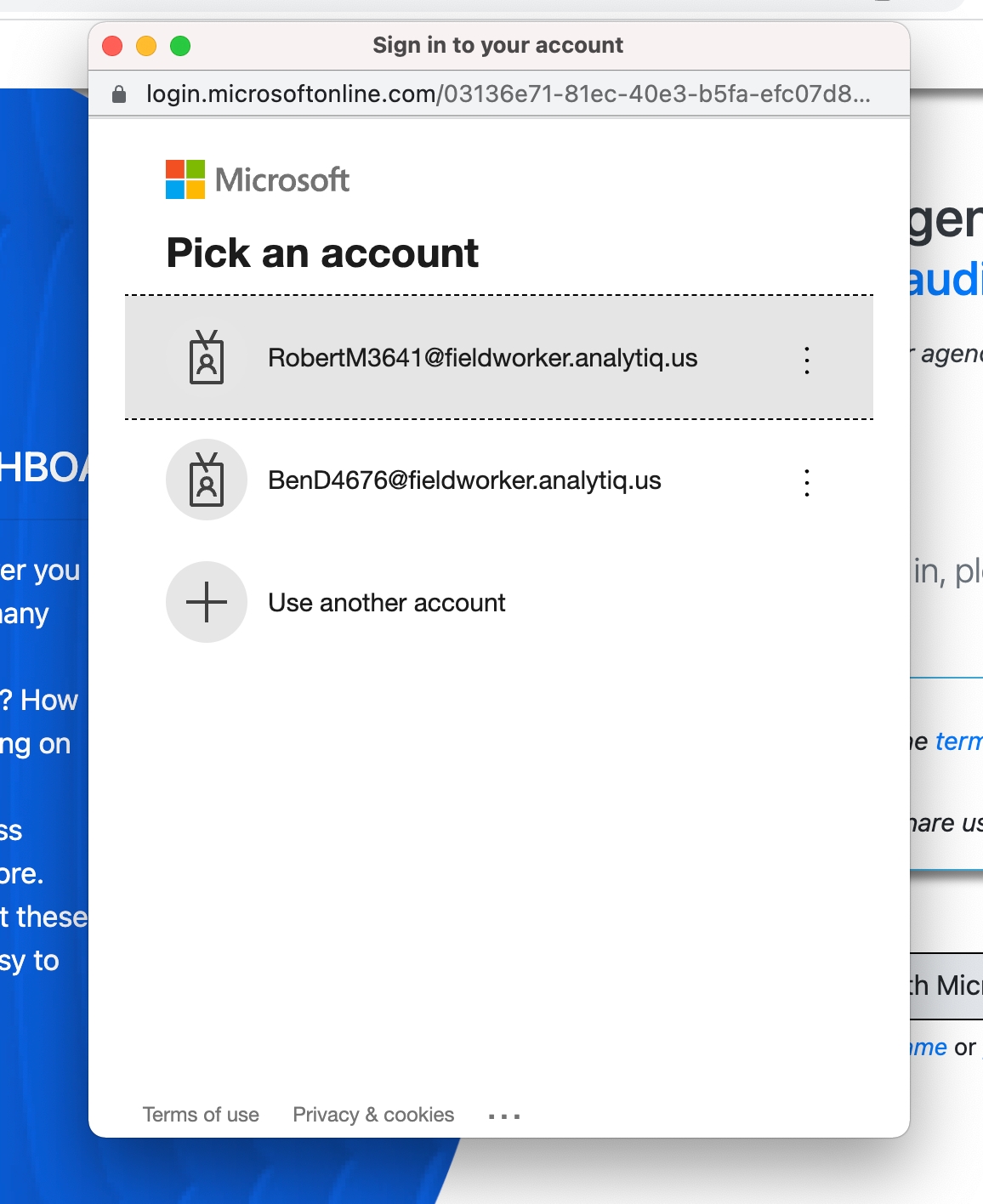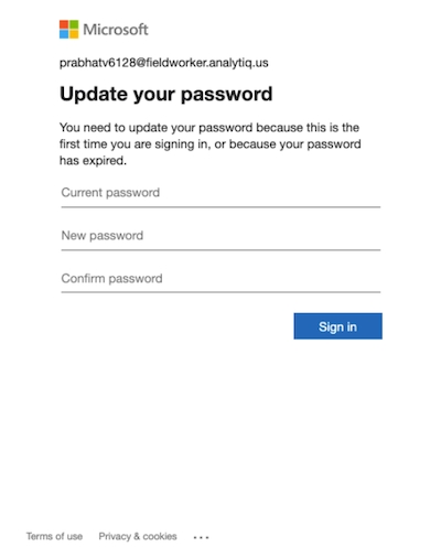 In your original email, you'll now be taken to your FieldWorker dashboard, where you will be logged in. Next time, when you click on "Sign in with Microsoft", your details may be saved or you will need to enter them again (including your new updated password).