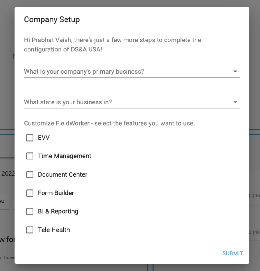 You'll be asked about your company's primary type of business, where your business is based, and which Fieldworker features you plan on using. This will help us understand more about what your team needs and the Fieldworker experience to suit the way you work.