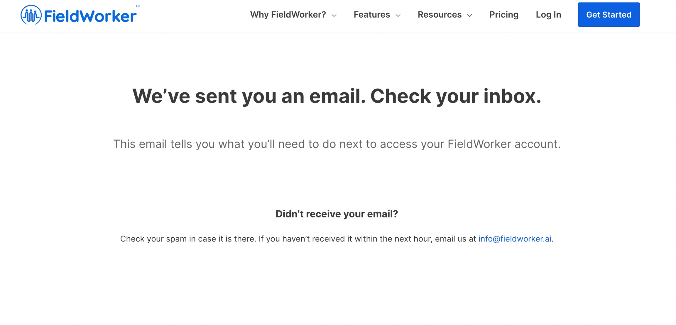 As this page says, you'll now need to check your inbox. If you don't receive an email within an hour of signing up, please check your spam folder. If it's not there, get in touch with us at support@fieldworker.ai and we'll be happy to help you get signed up!
