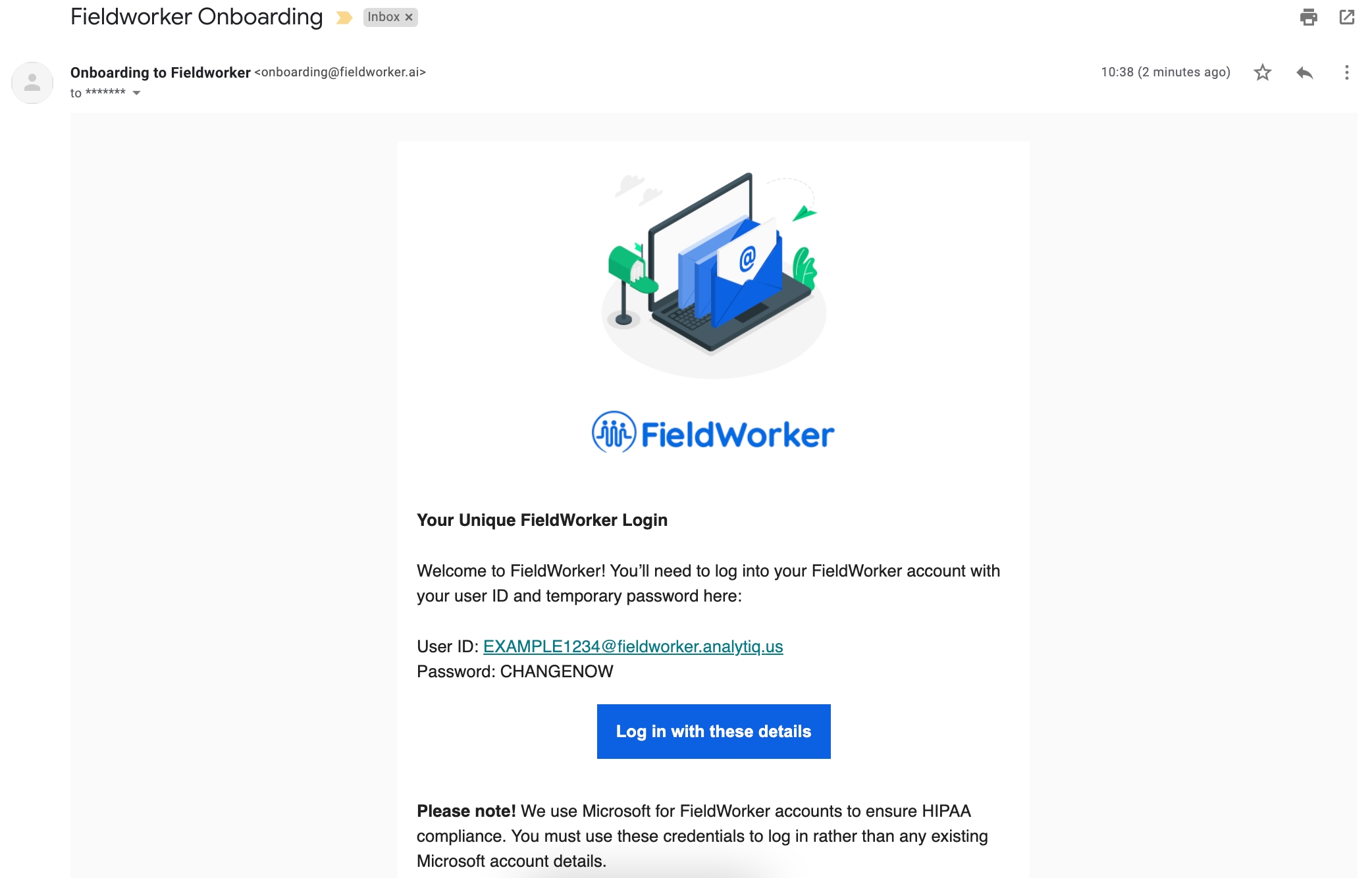 This email contains your unique FieldWorker – that is, a username and password that you'll need to use to access your account.