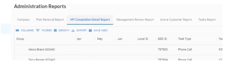“MT Completion Report” gives you an overview of all the current MTs and their statuses across your teams. “Management Review Report” contains all of the follow-up items for your clients: